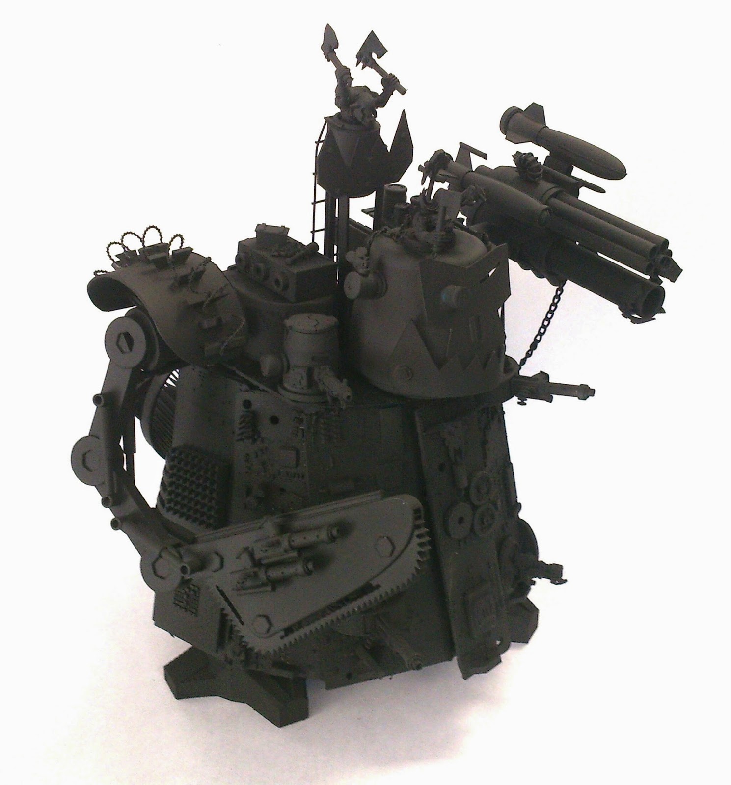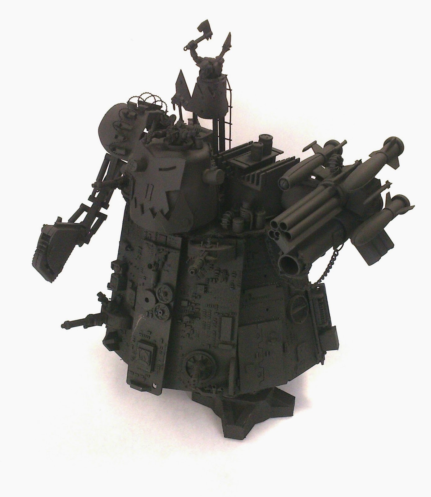 After a lot of chopping and glueing and swearing the monstrosity you see below was born. I think it suits the Orky tech ideal. Everyone in the office particularly likes his massive thermopile generator backside!